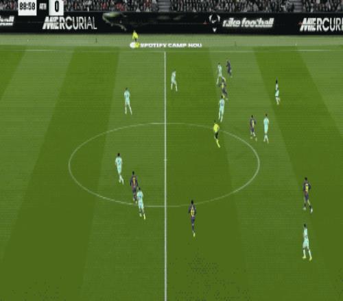 上半场结束,巴萨2-0暂时领先。下半场开始只有4分钟,巴萨前场持续施压完成抢断。