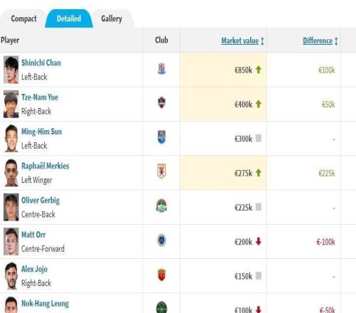 中超联赛港台球员身价榜:周定洋100万欧居首,陈晋一次席